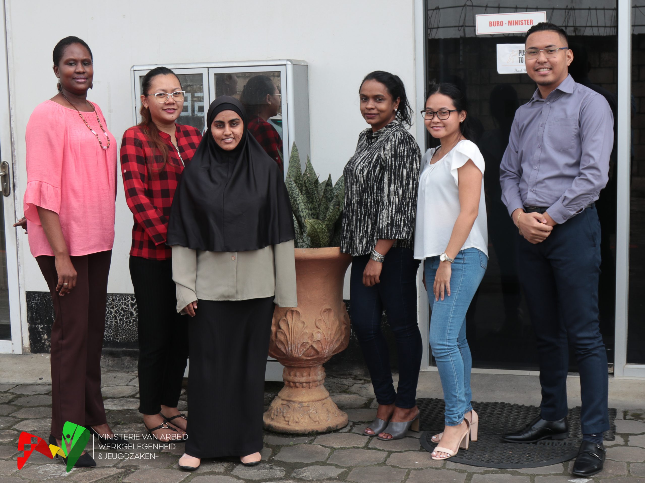 (Foto bijschrift – Onderzoekers: Naomi Esajas-Friperson (onderdirectrice Arbeidsmarkt), Vanity Amatigram (statistiekmedewerkster), Shaneeza Nasroe (Beleidsmedewerkster), Tirlotma Marhe-Kewal (Hoofd Arbeidsstatistieken) Debra Wirjosentono (statistiekmedewerkster) en Javier Samidin (Statistiekmedewerker)