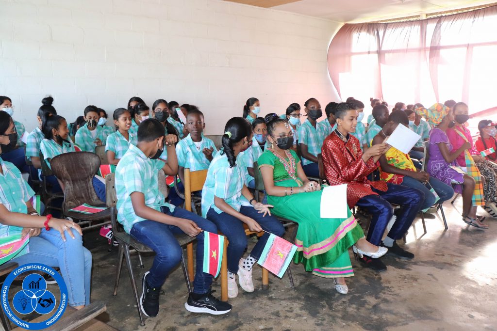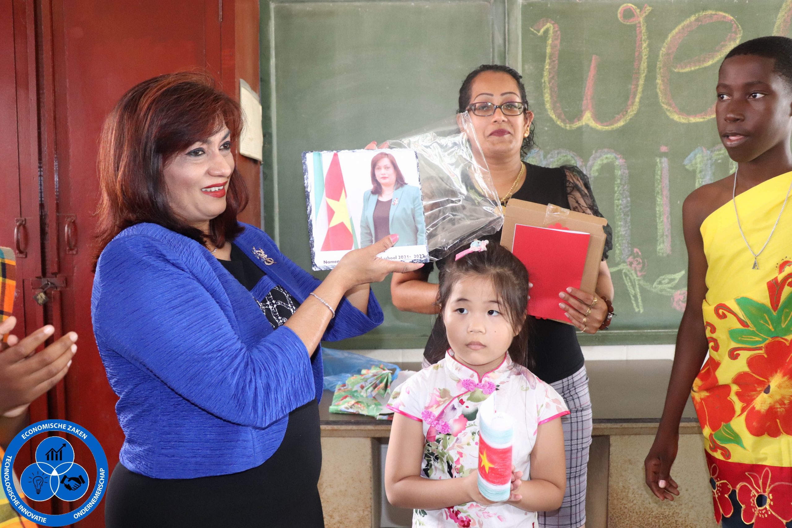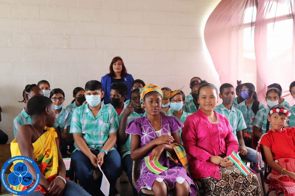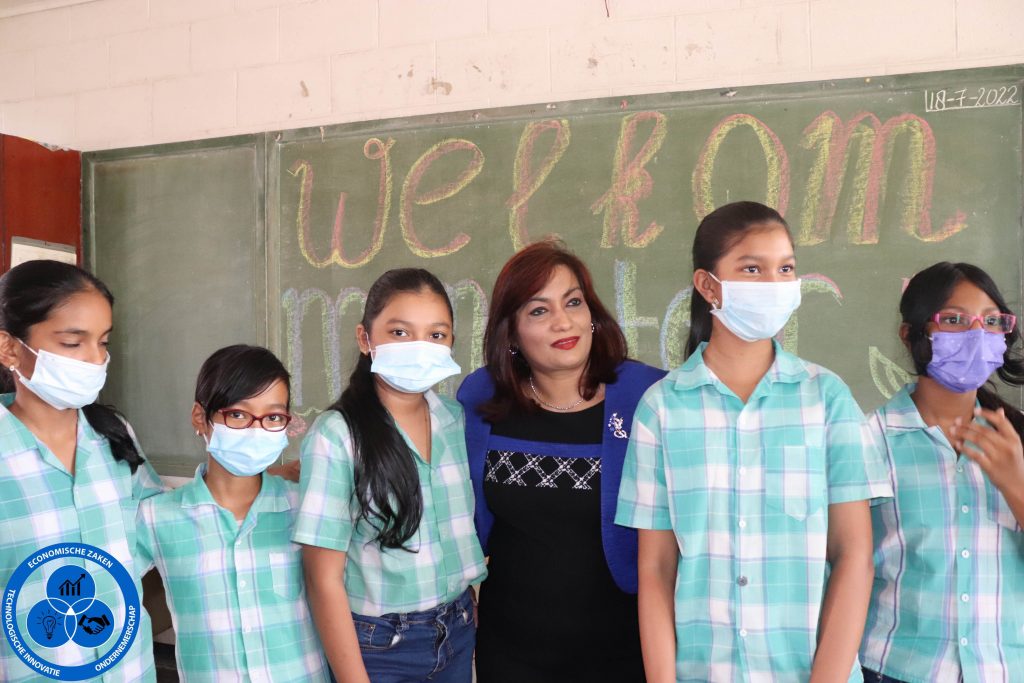 Minister Rishma Kuldipsingh van het ministerie van Economische Zaken, Ondernemerschap en Technologische Innovatie (EZ), heeft een bezoek gebracht aan de Swamiwiryanand school.