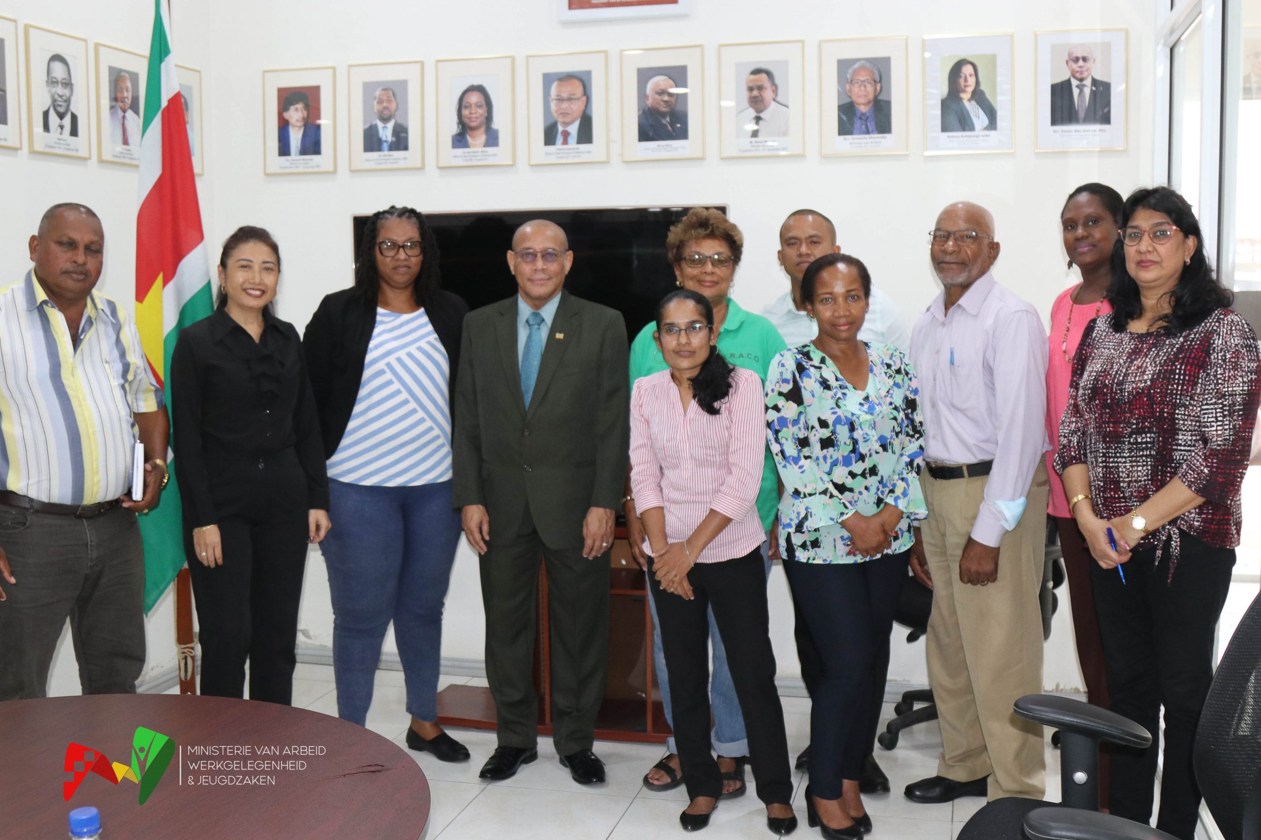 (Foto bijschrift – Vlnr: Bhoelai Shamkisoor (Landbouw Coƶperatie Kwatta), Karnadi Christine (ministerie Natuurlijke Hulpbronnen ), Sharron Karsters (ministerie Landbouw, Veeteelt en Visserij), minister Steven Mac Andrew, Claudette Etnel (Voorzitter RACO/ AWJ), Ixon-John Sanamin (Ministerie Economische zaken, Ondernemerschap & Technologische Innovatie), Roy Haverkamp (Federatie AgrariĆ«rs en Landarbeiders), Naomi Esajas-Friperson (onderdirecteur Arbeidsmarkt), Meena Kandhai-Ramai (Hoofd Bureau Minister), Ramdas Sandhya (AWJ), Foorty Joyce (Spaar- en Kredietcoƶperatie DeĀ Schakel).