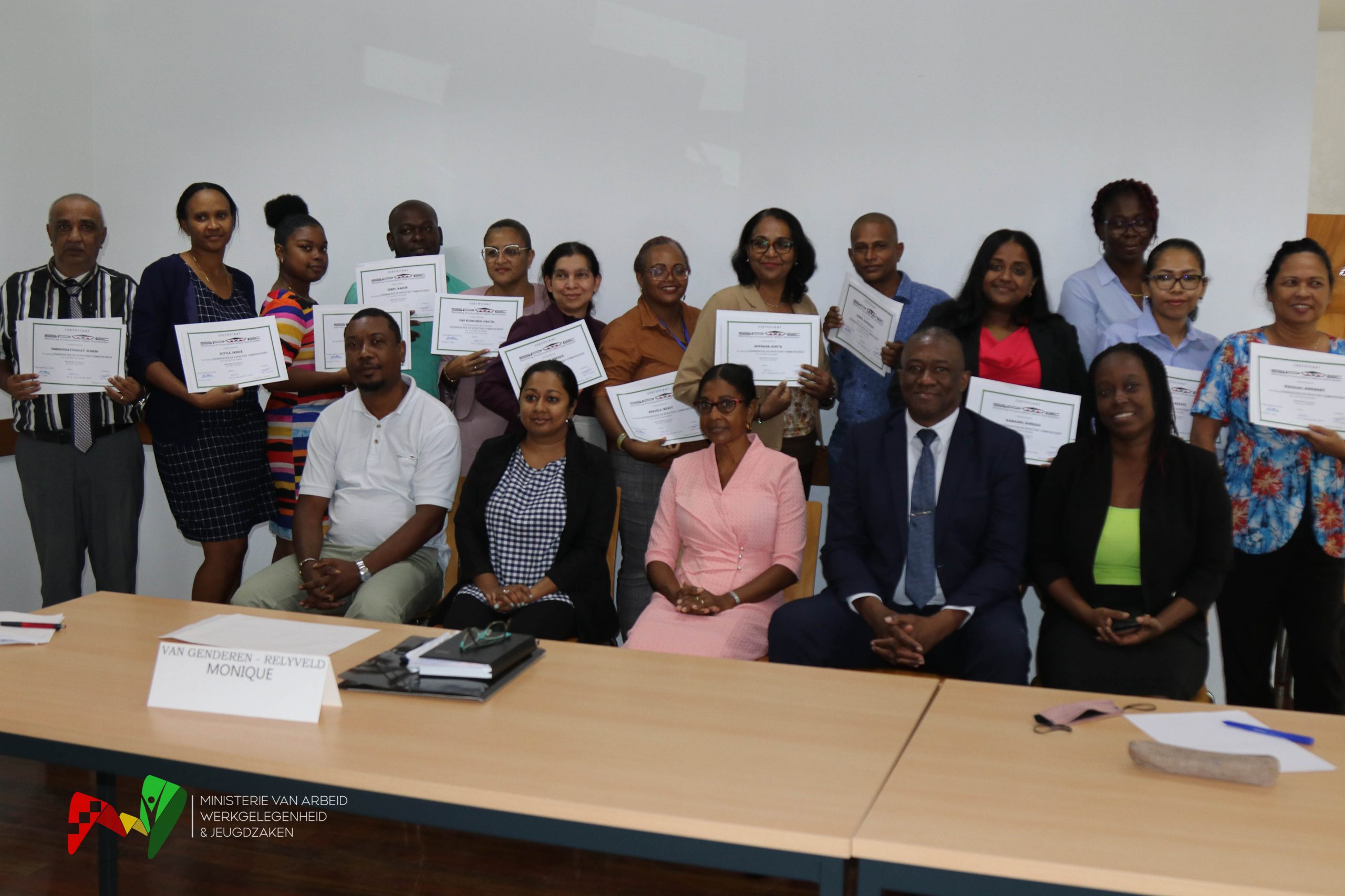 Zestien medewerkers van het Hof van Justitie hebben donderdag 21 juli hun certificaat na afronding van de training “Leidinggeven en effectief communiceren” in ontvangst mogen nemen, zo meldt het ministerie van Arbeid, Werkgelegenheid en Jeugdzaken, AW&J. Het betreft zes griffiers, zes substituut-griffiers, twee griffiemedewerkers en twee sectiechefs. De training werd verzorgd door de Stichting Productie Werk Eenheden (SPWE), een werkarm van het ministerie van AW&J, op 2, 3 en 4 juli.