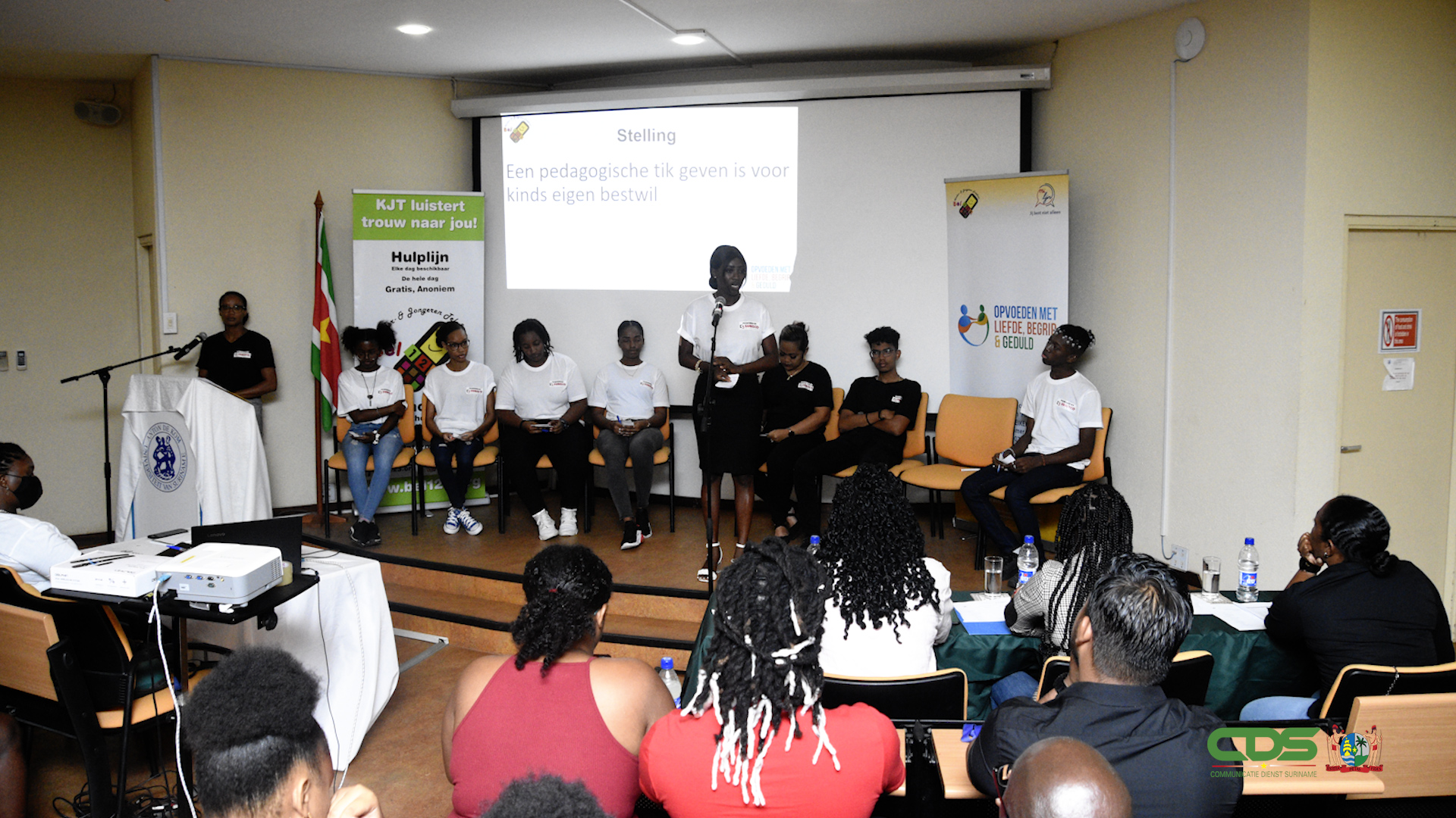 In de aula van het Institute for Graduate Studies and Research (IGSR) op het complex van de Anton de Kom Universiteit van Suriname (AdeKUS) hebben vrijdag 22 juli jongeren in een debat hun gedachten laten gaan over opvoeding zonder lijfstraffen. Dit jongerendebat was onderdeel van het symposium ‘Opvoeden met Liefde, Begrip en Geduld; A call for Action’ dat door de Stichting Kinder- en Jongerentelefoon (KJT) gehouden werd in het kader van het project ‘Opvoeden met Liefde, Begrip en Geduld’.