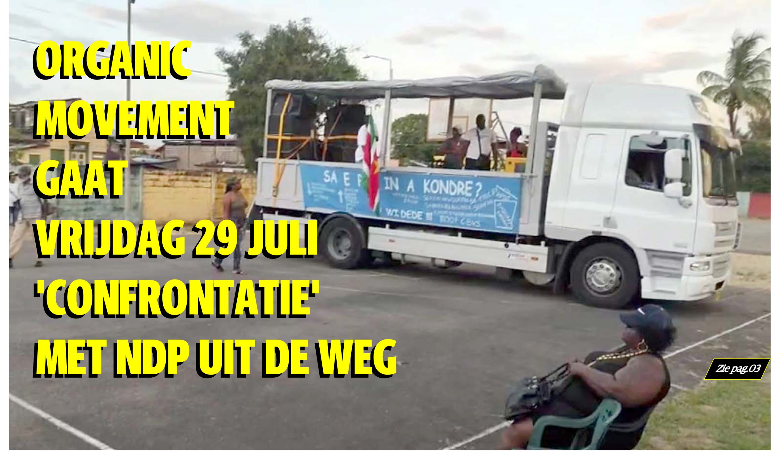 Maar, ook wordt op social media geïnsinueerd dat de NDP wel degelijk betrokken is bij de protesten. Ter staving van die insinuatie zijn foto’s gepubliceerd van een vrachtwagen die door Organic Movement als ‘soundtruck’ en podium is gebruikt, welke truck van de NDP zou zijn. Dat wil zeggen, de truck staat geparkeerd in een ruimte van de NPD Noord… en…. 1 plus 1 is 2, aldus personen op social media. Of het gebruik van een vrachtwagen, die mogelijk van de NDP is, automatisch wil zeggen, dat die partij achter de schermen een vinger in de pap heeft bij de protesten van de afgelopen dagen, is een ieders inlevingsvermogen en fantasie. Maar, dat dergelijke zaken rondgaan op social media zegt veel over de sfeer waarin het land deze dagen verkeert. Een sfeer van ongenuanceerde verdachtmakingen, scenario’s, fake news, etcetera.
