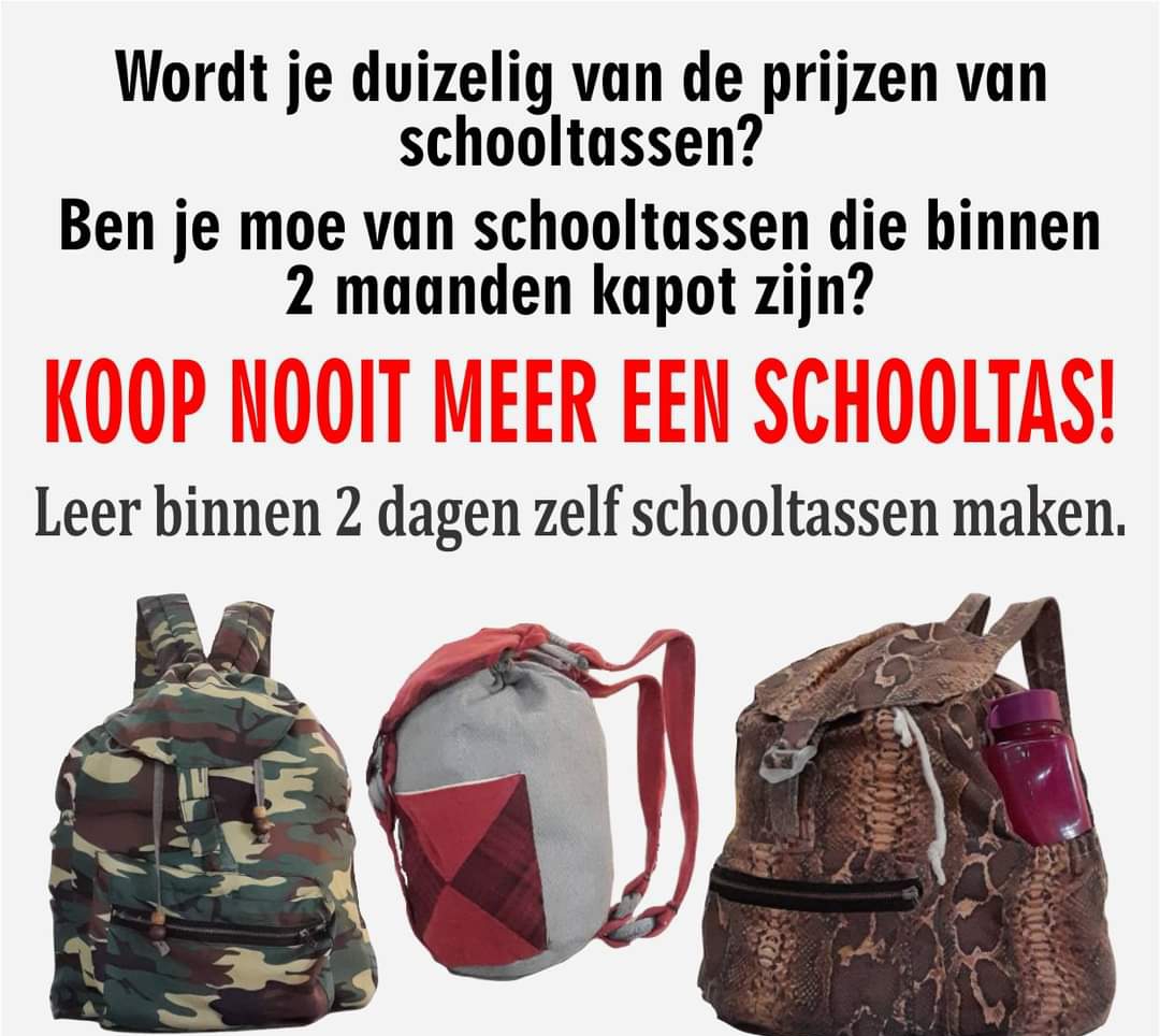 De training wordt verzorgd door Uretha Samuel, echtgenote van de heer Samuel. Na jaren schooltassen gekocht te hebben die soms na een maand reeds kapot waren, besloot Uretha enkele jaren geleden zelf schooltassen te maken voor hun kinderen. Deze bleken veel steviger te zijn en jaren mee te gaan in tegenstelling tot tassen die zij in de winkel gekocht hadden. Uiteindelijk werd het idee geboren om ook andere te gaan helpen hiermee. Zo ontstond dus de training “maak je eigen schooltas”.