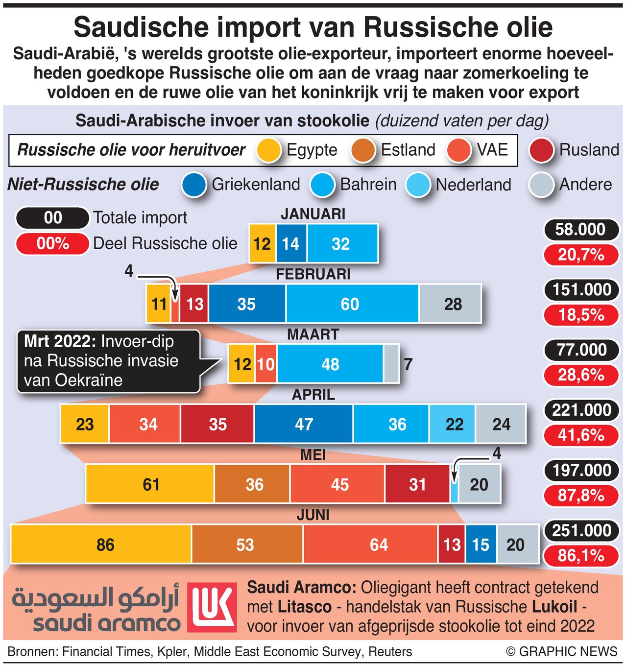 Saoedi-Arabië, ’s werelds grootste olie-exporteur, importeert stijgende hoeveelheden Russische olie met korting om te voldoen aan de vraag naar koeling in de zomer en om de ruwe olie van het koninkrijk vrij te maken voor export.