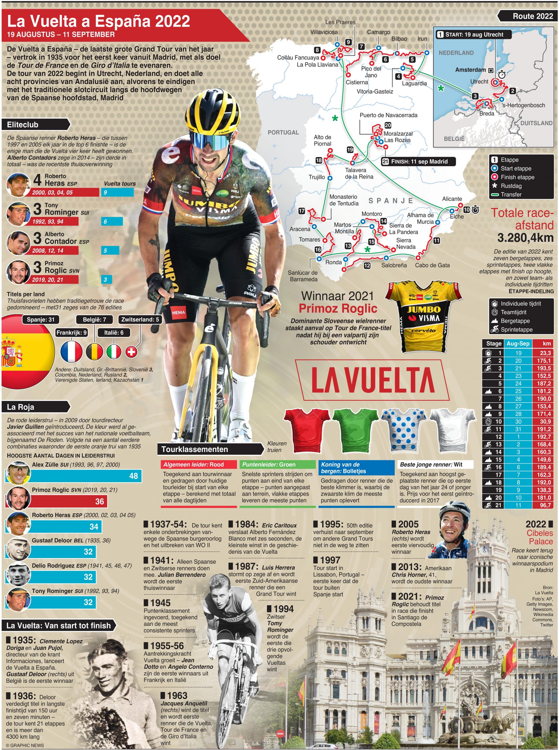 19 augustus 2022 – 11 september 2022 – De 77e editie van de Vuelta a España, de laatste grote wielerronde van het jaar, zal meer dan drie weken racen en 21 etappes bevatten, over een afstand van 3.280 km.