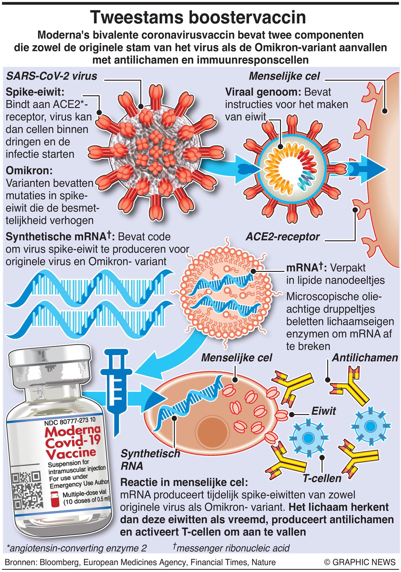 Wanneer gevaccineerd met de bivalente injectie, zullen sommige cellen van een persoon de mRNA-instructies lezen en tijdelijk de spike-eiwitten van beide varianten produceren. Het immuunsysteem van de persoon zal deze eiwitten dan als vreemd herkennen, antilichamen produceren en T-cellen (witte bloedcellen) activeren om ze aan te vallen. De eiwitten en mRNA verdwijnen binnen enkele dagen uit het lichaam.