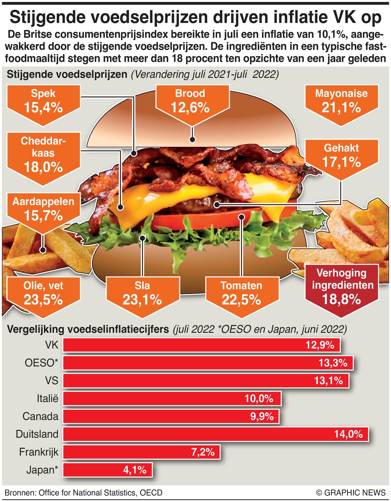 De inflatie van de Britse consumentenprijsindex bereikte in juli 10,1%, gedreven door stijgende voedselprijzen. De ingrediënten in een typische fastfoodmaaltijd zijn met meer dan 17 procent gestegen ten opzichte van een jaar geleden.