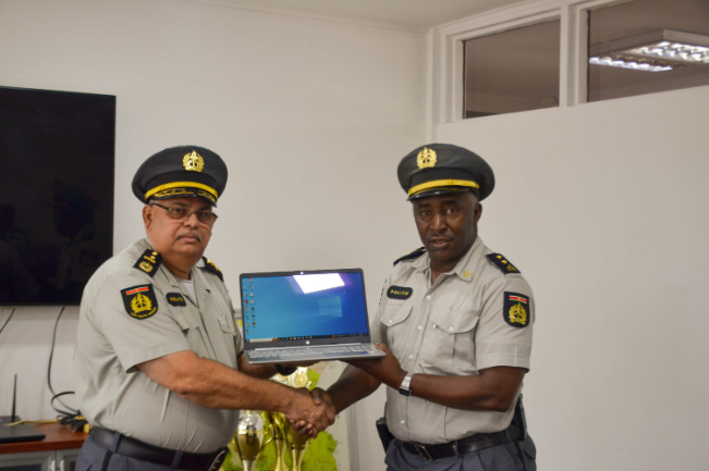 De leiding van het Korps Politie Suriname heeft donderdag 18 augustus 21 laptops, 3 beamers en 56 mobiele telefoons overhandigd aan de landelijke coördinator van de Buurt Managers (BM’s), de Inspecteur van Politie 2e klasse, Henry Kia.