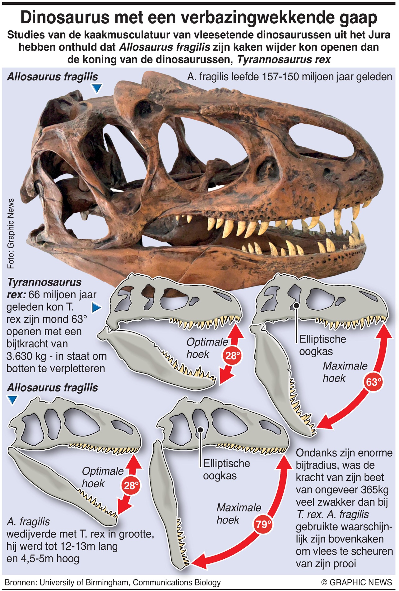 17 augustus 2022 – Onderzoek naar de kaakspieren van vleesetende dinosauriërs uit de Jurassic Periode heeft aangetoond dat Allosaurus fragilis zijn kaken verder kan openen dan de koning van de dinosauriërs, Tyrannosaurus rex.
