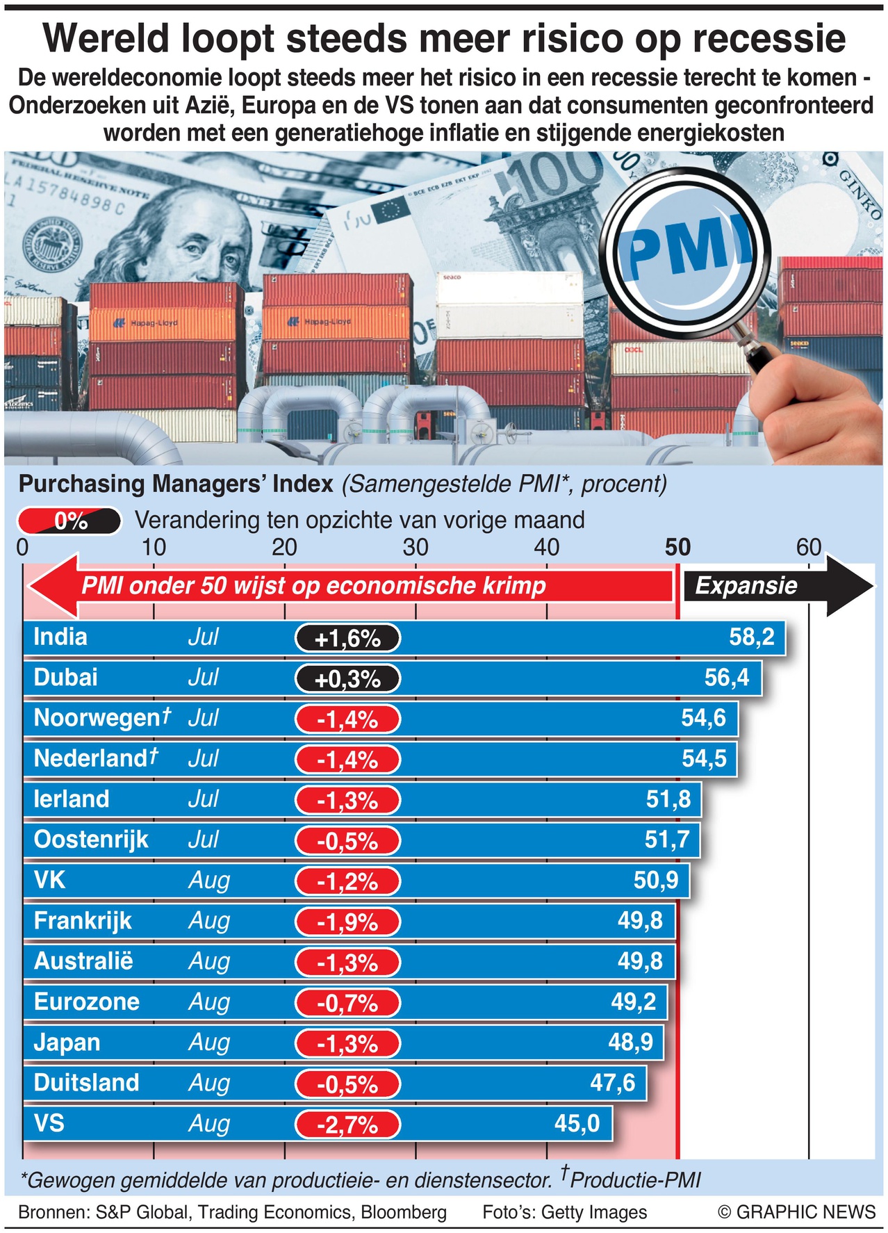De gegevens van de Purchasing Managers’ Index (PMI) worden samengesteld door S&P Global voor meer dan 40 landen wereldwijd en geven inzicht in de gezondheid van de wereldeconomie. Een PMI van meer dan 50 procent duidt op economische expansie, terwijl een PMI van minder dan 50 procent wijst op krimp en een mogelijke recessie.