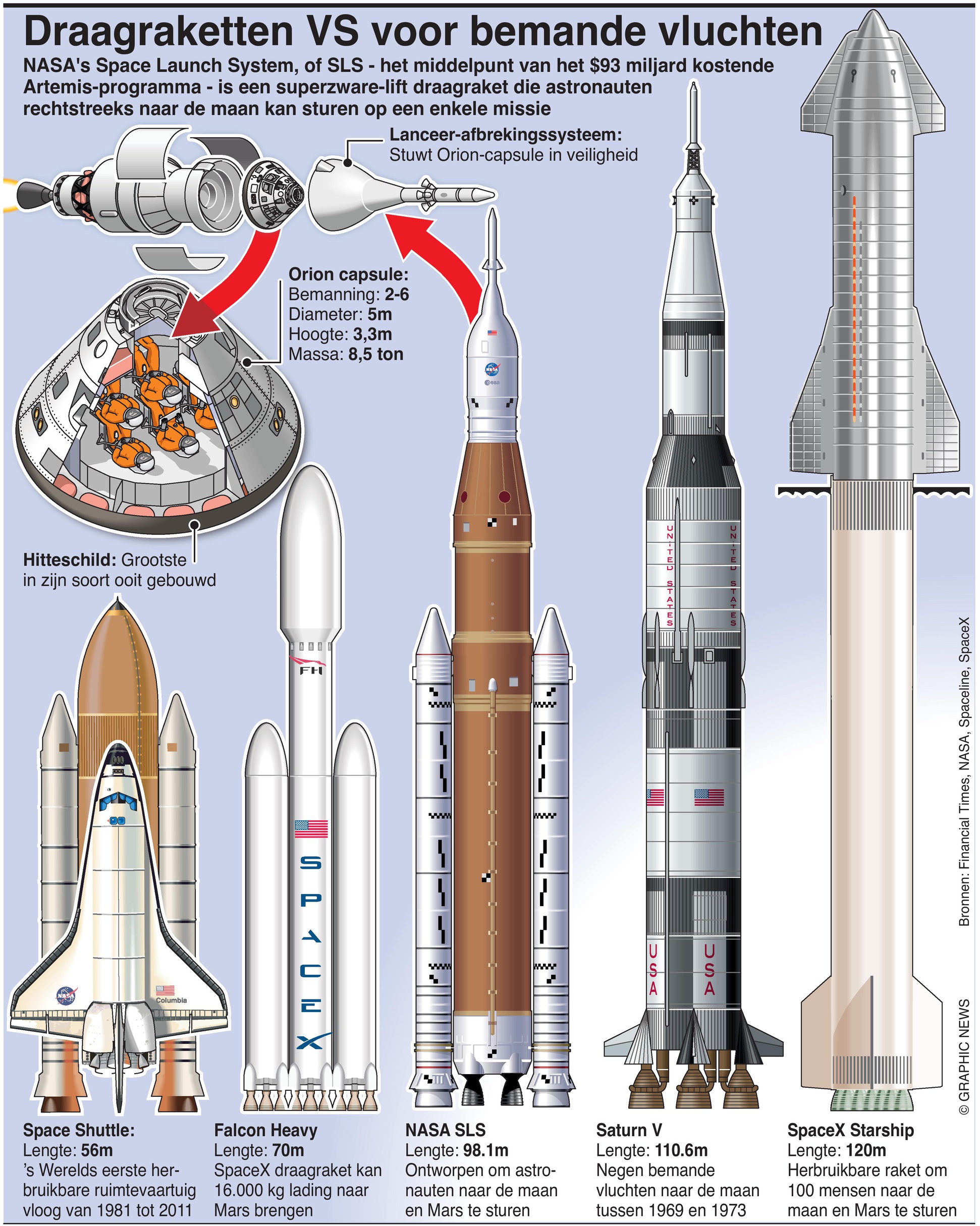 De SLS is 98,1 meter hoog en zijn vier RS-25-motoren leveren ongeveer 900 ton stuwkracht – meer dan de Saturn V-raketten die Apollo-missies naar de maan brachten tussen 1969 en 1973.