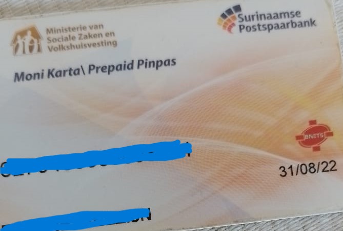 Burgers die voorzien worden van financiële steun hebben een “Moni Karta”, waarmee ze maandelijks na de nodige wegen te hebben afgelegd een bedrag kunnen pinnen bij de Surinaamse Postspaarbank (SPSB) om zodoende hun financiële situatie onder controle te houden.