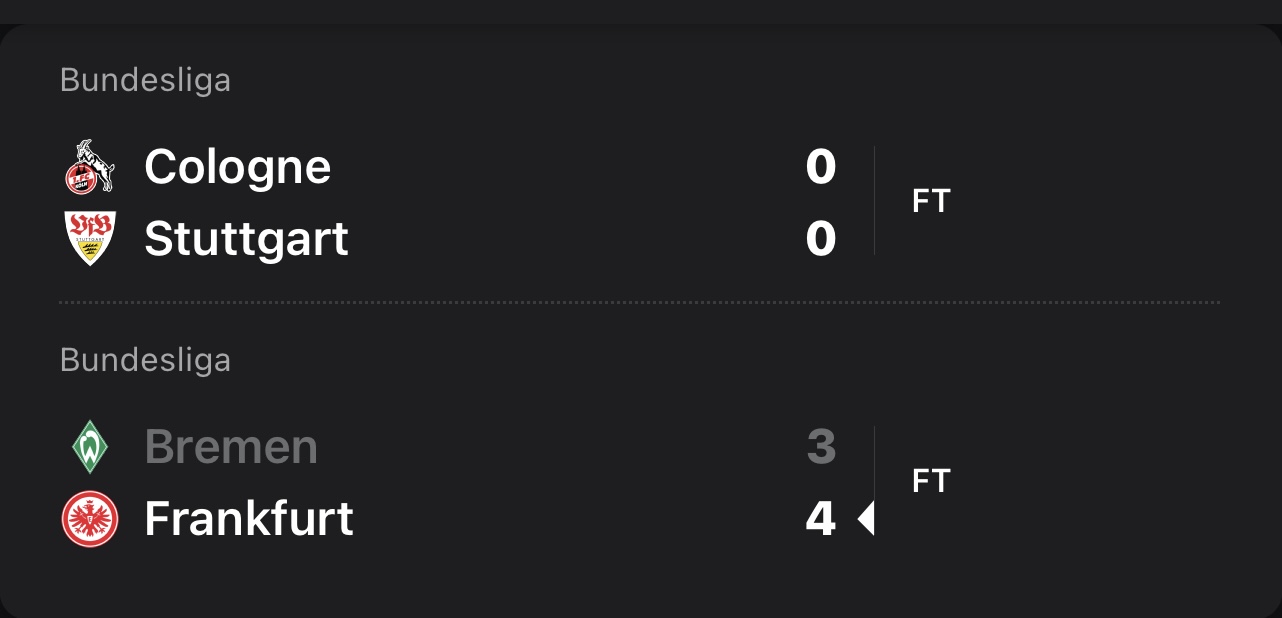 Eerder op de dag werd FC Keulen op een doelpuntloos gelijkspel gehouden door 10-koppig VfB Stuttgart nadat Luca Pfeiffer bij zijn eerste start voor de club direct rood kreeg voor een roekeloze uitdaging op Timo Hubers in de tweede helft.