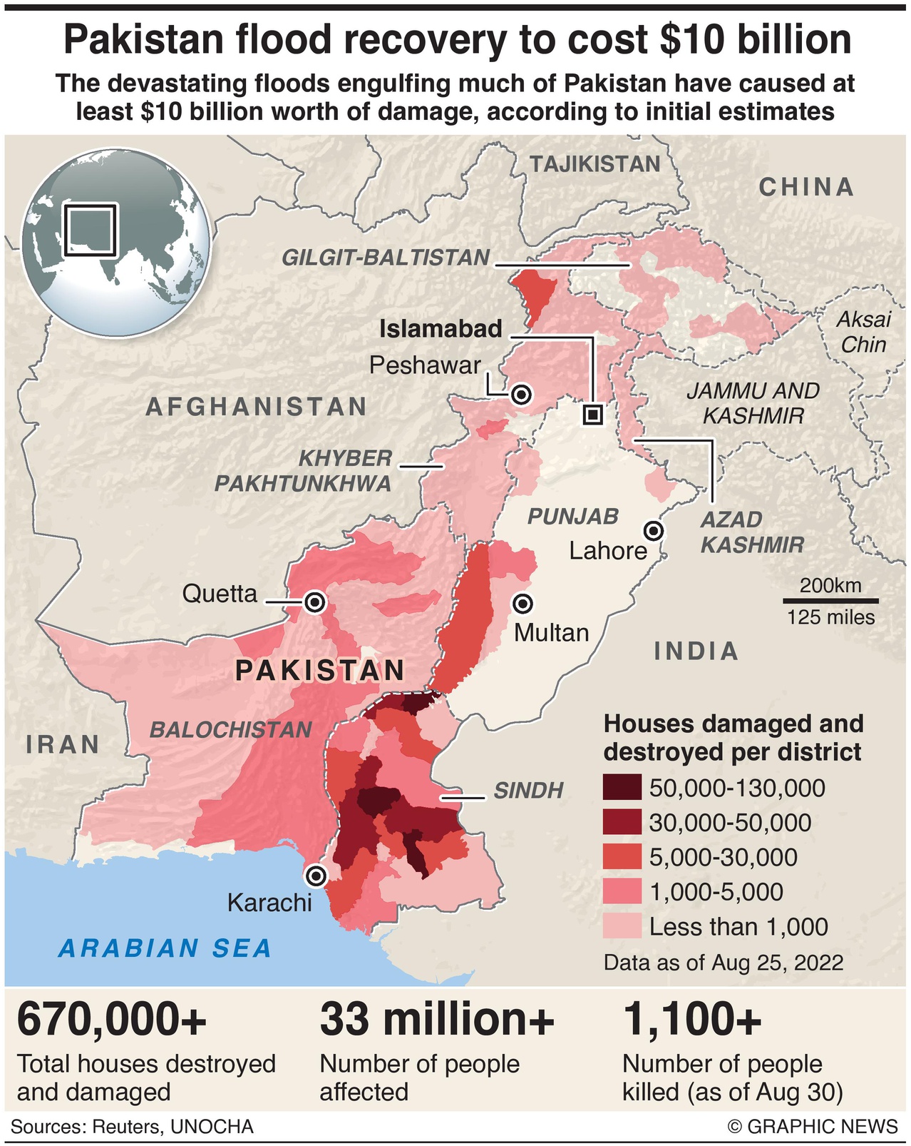 30 augustus 2022 – Pakistan heeft meer dan $ 10 miljard nodig om het hoofd te bieden aan recordmoessonregens die verwoestende overstromingen hebben veroorzaakt, waarbij meer dan 30 miljoen mensen zijn getroffen en minstens 1.000 zijn omgekomen.