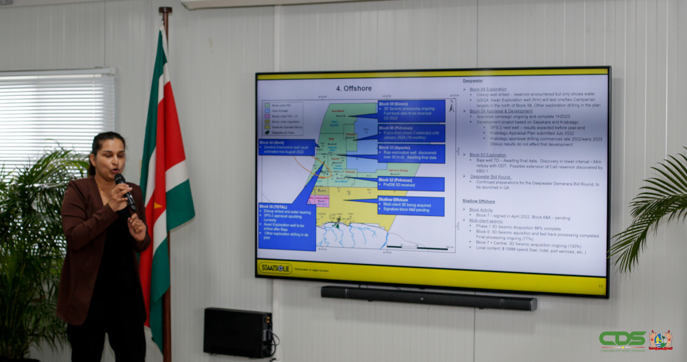 “We hebben recent onze strategische plannen die gaan tot 2040 weer geëvalueerd. Voor ons was het belangrijk om hen te interesseren in de activiteiten waar we groeimogelijkheden in zien”, aldus Agnes Moensi-Sokowikromo, financieel directrice van Staatsolie. Het directielid benadrukte dat de mogelijkheden enorm zijn in de offshore olie-en gasindustrie.