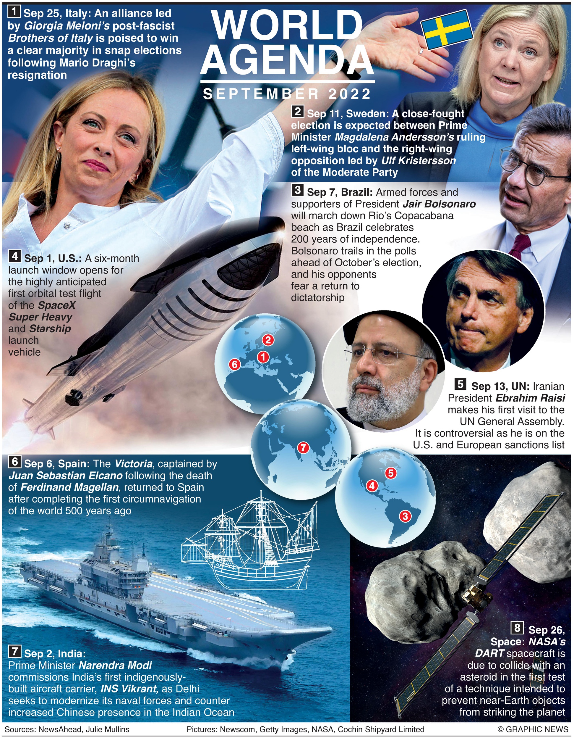 1 september 2022 – 1 oktober 2022 – Elke maand publiceert Graphic News een Wereldagenda met aanstaande evenementen die de wereld de komende maand vorm zullen geven. Evenementen in september zijn onder meer vervroegde verkiezingen in Italië, algemene verkiezingen in Zweden, de 200ste verjaardag van Brazilië, de ingebruikname van India’s eerste in eigen land gebouwde vliegdekschip en NASA’s DART-ruimtevaartuig zal proberen te botsen met een asteroïde.