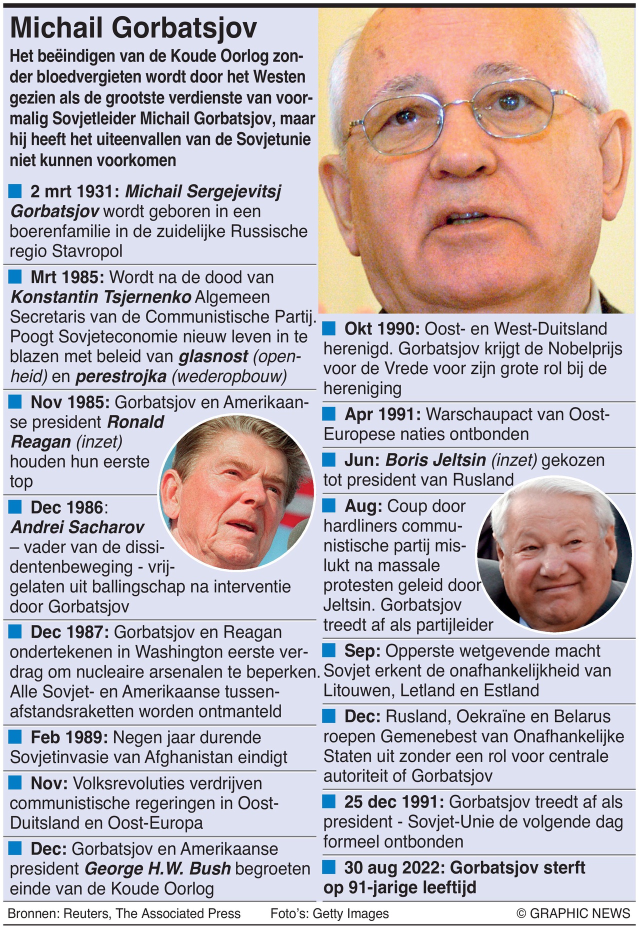 Michail Gorbatsjov is overleden. De laatste leider van de Sovjet-Unie kampte al enkele jaren met gezondheidsproblemen en stierf volgens Russische staatsmedia in het ziekenhuis. Daarmee verdwijnt een van de belangrijkste figuren die de 20e eeuw heeft hertekend, al gebeurde dat hertekenen niet volgens het plan dat hij in gedachten had. Zijn hervormingen kwamen te laat om de Sovjet-Unie te redden, en de door het communisme onderdrukte nationalistische reflexen staken opnieuw de kop op. Gorbatsjov werd 91 jaar.