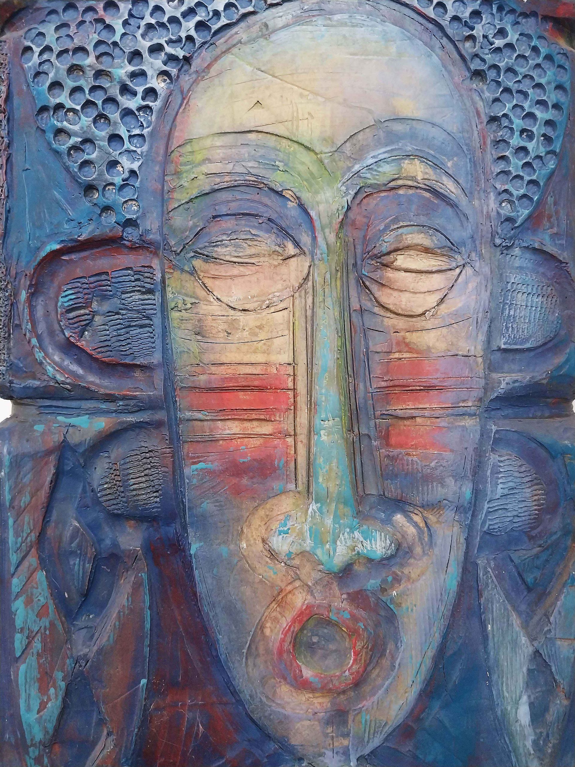 Sri toont ook een indrukwekkende blauwe keramische sculptuur van haar vader die zij recentelijk in zijn huis vond. Geïnspireerd door deze vondst selecteert zij uit de collectie van Readytex Art Gallery kunstwerken waarin de kleur blauw dominant is.