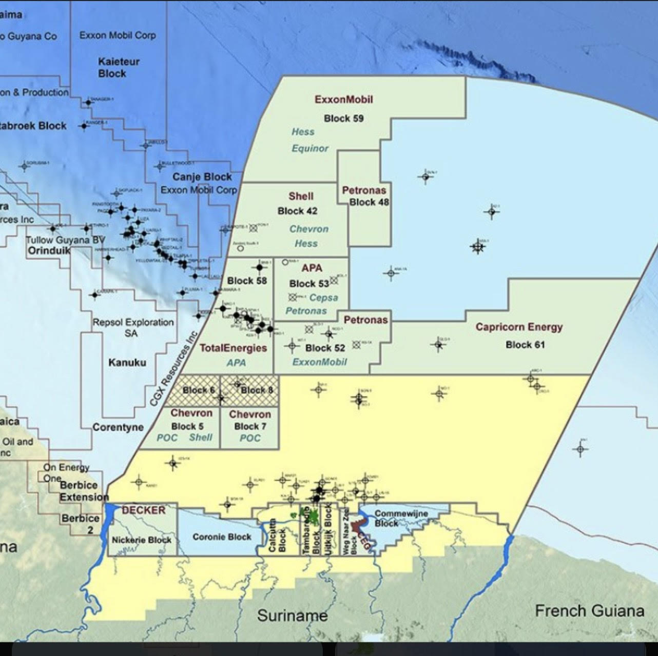 Blok 58 grenst aan het Stabroek-blok in Guyana, waar sinds mei 2015 meer dan 30 ontdekkingen zijn gedaan. van die Liza 1 en 2 van Guyana produceren in totaal ongeveer 360.000 vaten olie per dag. Een derde project bij Payara is gepland om eind 2023 van start te gaan en een vierde ontwikkeling bij Yellowtail is gericht op het opstarten in 2025, stelt de nieuwswebsite OilNow.
