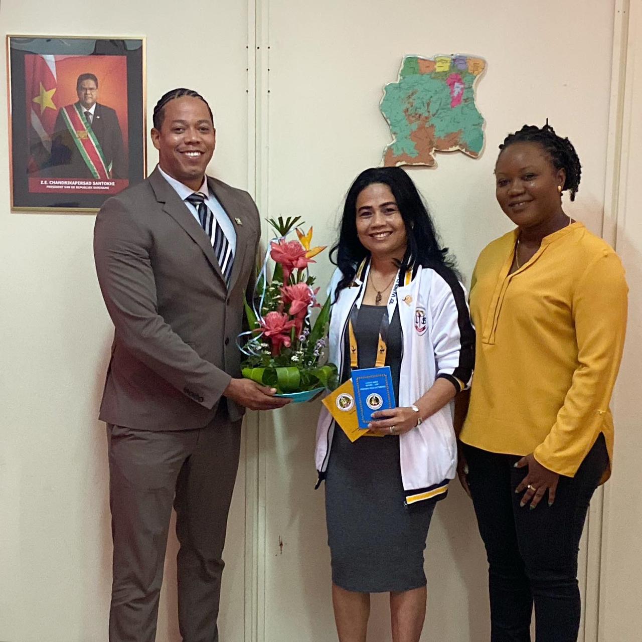 De directeur van Sportzaken, Gordon Touw Ngie Tjouw, heeft naast onderdirectrice Deborah Winson, de felicitaties overgebracht en als blijk van waardering voor de bereikte prestatie in de sportwereld, in het bijzonder als vrouw, een bloemstuk overhandigd.