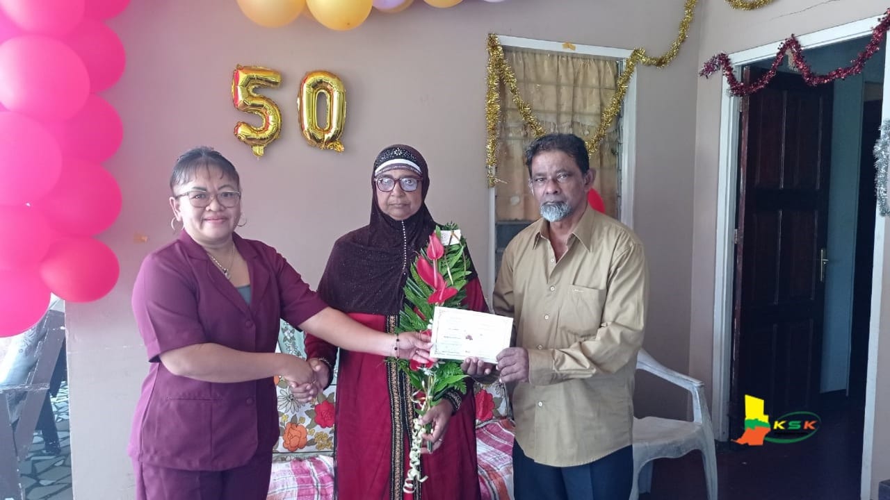 Districtssecretaris Baboelal bracht de felicitaties over aan het echtpaar. Zij kregen een bloemstuk, felicitatiekaart en een ingelijste foto.
