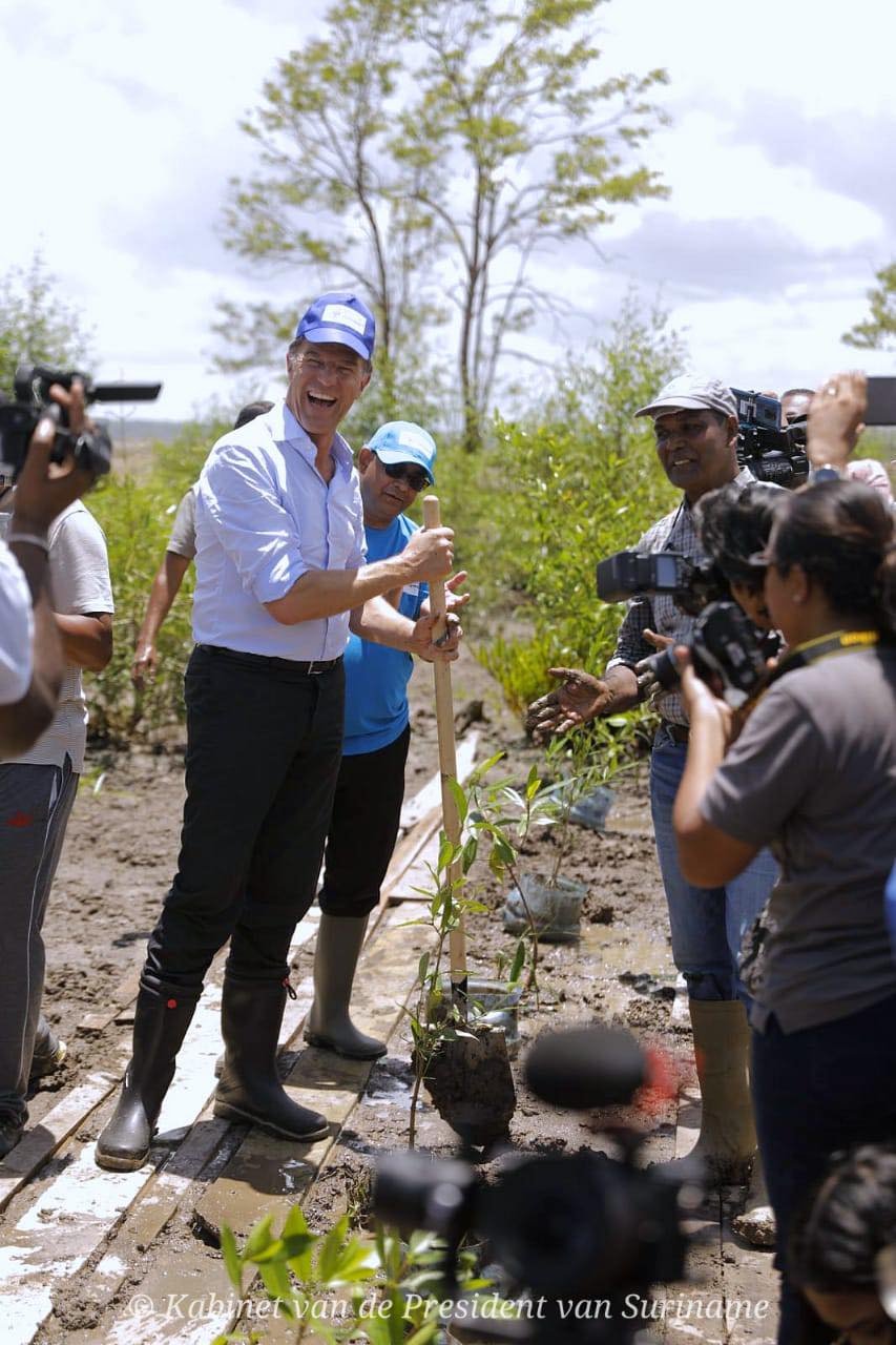 Daarbij hebben president Santokhi en minister-president Rutte mangrove boompjes geplant. Eerder dit jaar was ook de secretaris-generaal van de Verenigde Naties te Weg naar Zee voor het planten van mangroves.