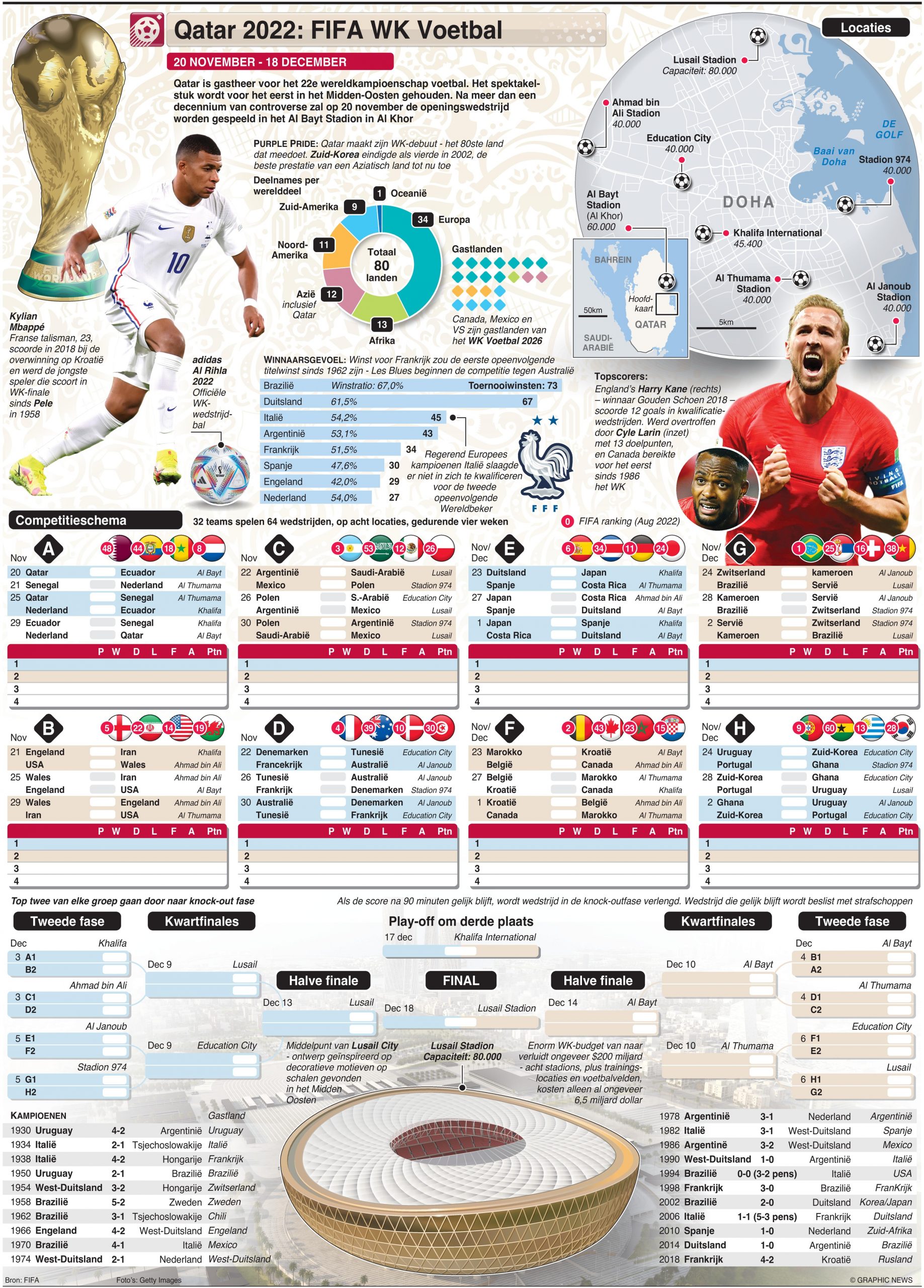 In totaal worden er 64 wedstrijden gespeeld op acht locaties gedurende vier weken, met de finale op 18 december in het Lusail Iconic Stadium.