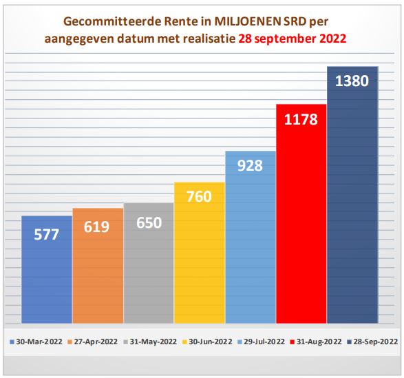 De totale gecommitteerde rentebetalingen aan de algemene banken is ondertussen gestegen naar dichtbij de SRD 1,4 miljard.