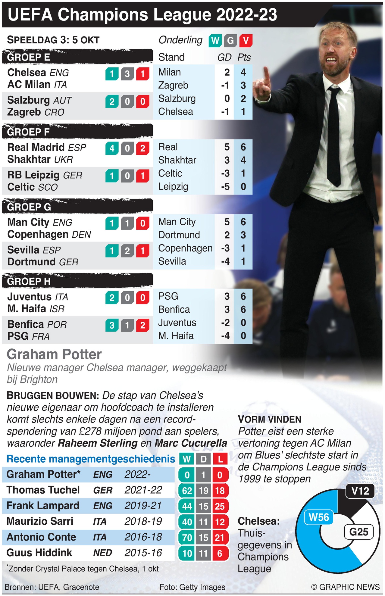 5 oktober 2022 – UEFA Champions League speeldag 3, woensdag wedstrijden. Europa’s nieuwe UEFA Champions League-seizoen gaat door, met belangrijke wedstrijden, waaronder het worstelende Chelsea, waar de nieuwe manager Graham Potter het opneemt tegen AC Milan. De finale wordt op 10 juni 2023 gespeeld in het Atatürk Olympisch Stadion, Istanbul, Turkije.