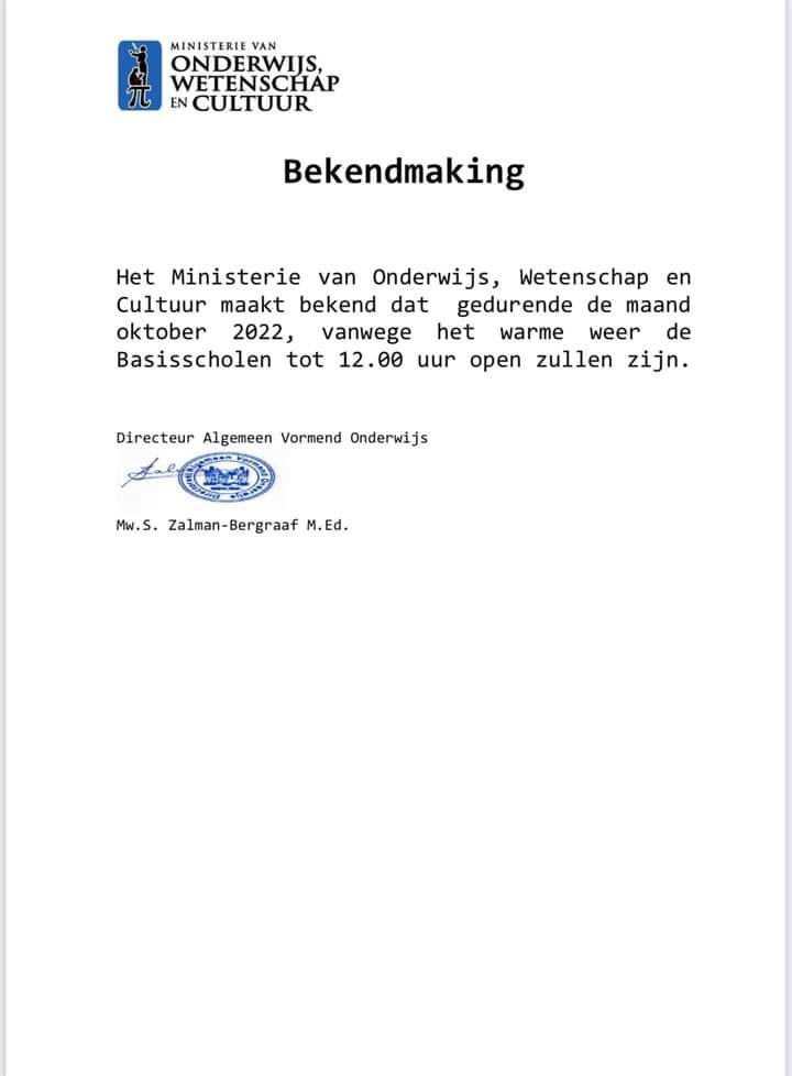Het ministerie maakt verder bekend, dat gedurende de maand oktober, de basisscholen vanwege het warme weer tot 12.00 uur open zullen zijn. Het is al enkele jaren zo, dat de basisscholen eerder sluiten in oktober. Velen in de samenleving vragen zich echter af, waarom dit alleen voor basisscholen geldt en niet voor scholen als het Voortgezet Onderwijs, want die krijgen immers ook te kampen met de hitte.