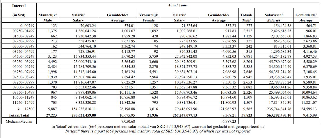 Uit het salarissen bestand van de overheid blijkt, dat in juni 2022 aan in totaal 59.823 personen salarissen zijn uitbetaald. Dit aantal is onderverdeeld in 27.223 mannen (47%) en 31.936 vrouwen (53%). Van in totaal 644 personen die bij de overheid werken is het geslacht niet gerapporteerd. Het totaal aan bruto uitbetaalde salarissen aan landsdienaren bedroeg in juni 2022 ruim SRD 563 miljoen.