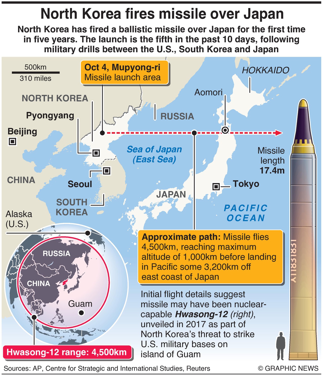 4 oktober 2022 – Noord-Korea heeft voor het eerst in vijf jaar een raket afgevuurd boven Japan. De lancering van de Hwasong-12 is de vijfde in tien dagen, na militaire oefeningen door de VS, Zuid-Korea en Japan.