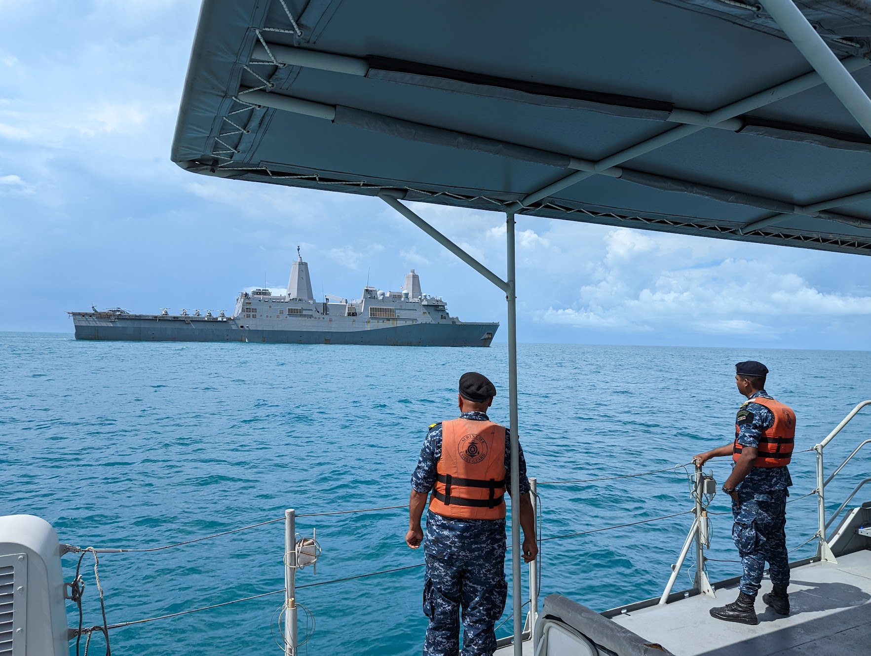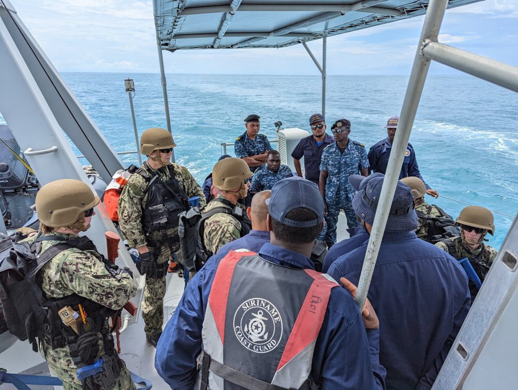 Afgelopen maandag, 3 oktober, hebben Amerikaanse zeestrijdkrachten en de Surinaamse marine en Kustwacht samen op zee operatie oefeningen uitgevoerd. Daarbij was het marineschip de USS Mesa Verde betrokken. Er werden oefeningen gehouden met Surinaamse militairen.