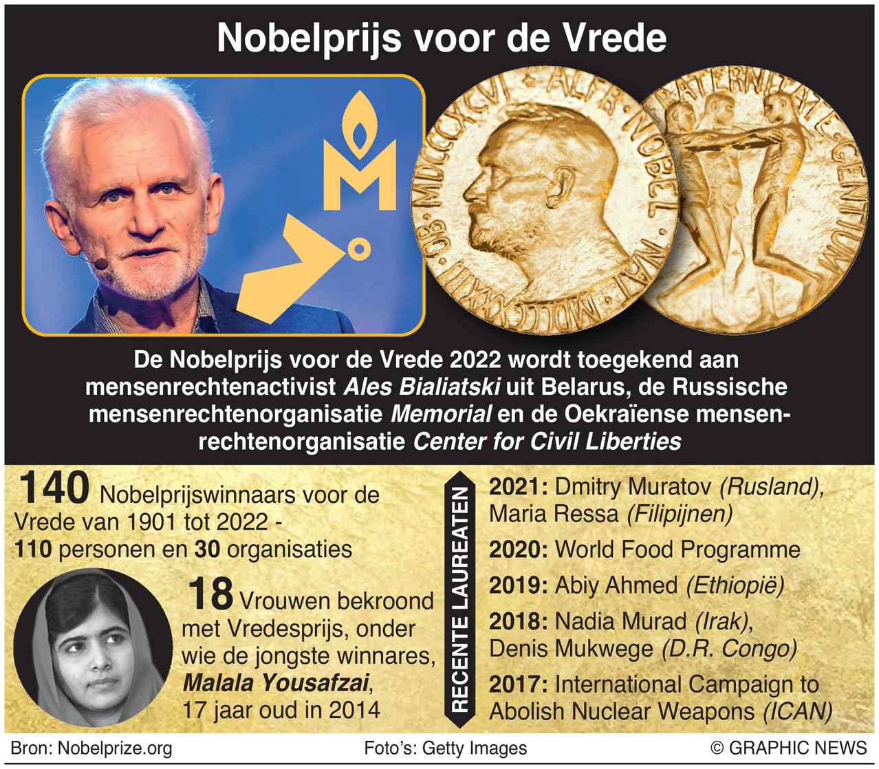 7 oktober 2022 – De Nobelprijs voor de Vrede 2022 wordt uitgereikt aan mensenrechtenadvocaat Ales Bialiatski uit Wit-Rusland, de Russische mensenrechtenorganisatie Memorial en de Oekraïense mensenrechtenorganisatie Centre for Civil Liberties.