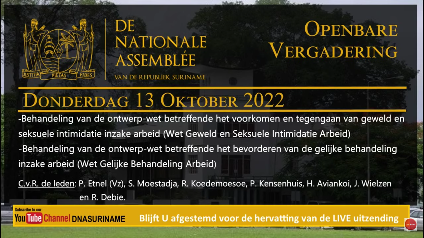 De Nationale Assemblee heeft donderdag 13 oktober met algemene (41) stemmen twee belangrijke arbeidsgerelateerde wetten goedgekeurd. Het gaat om de Wet Geweld en Seksuele Intimidatie Arbeid en de Wet Gelijke Behandeling Arbeid.