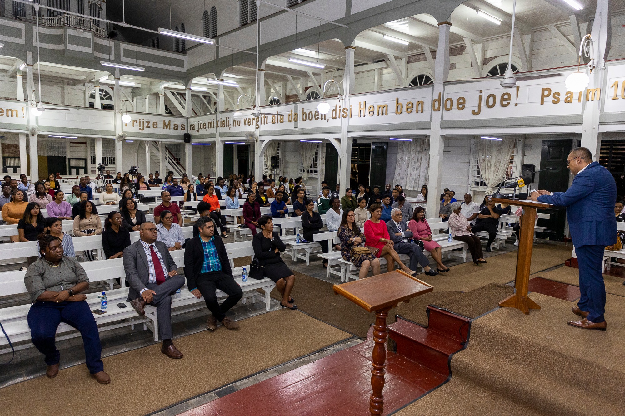 Hans Lim A Po, rector van FHR, Mario Merhai, CEO van Assuria, Rishma Kuldipsingh, minister van Economische Zaken, Ondernemerschap en Technologische Innovatie en Jessie Doorson, Master of Public Administration student van FHR, hebben allen de aanwezigen toegesproken.