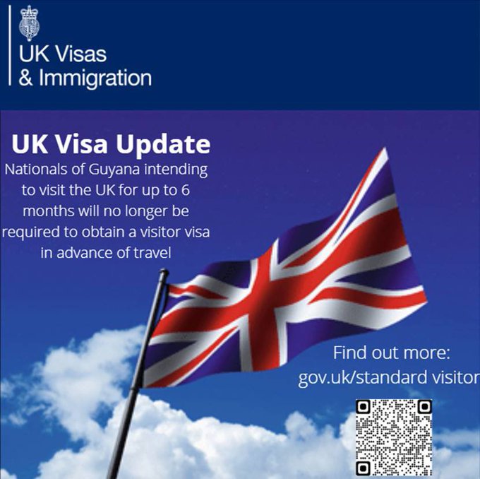 De Britse Hoge Commissaris voor Guyana, Jane Miller, heeft dinsdag 18 oktober in Georgetown aangekondigd, dat de visumplicht voor Guyanezen om het Verenigd Koninkrijk te bezoeken is opgeheven. Hiermee kan een Guyanese bezoeker vanaf november zes maanden in het VK verblijven. Miller merkte op, dat de typische visumvereisten voor werk, studie en vestiging niet zijn gewijzigd.