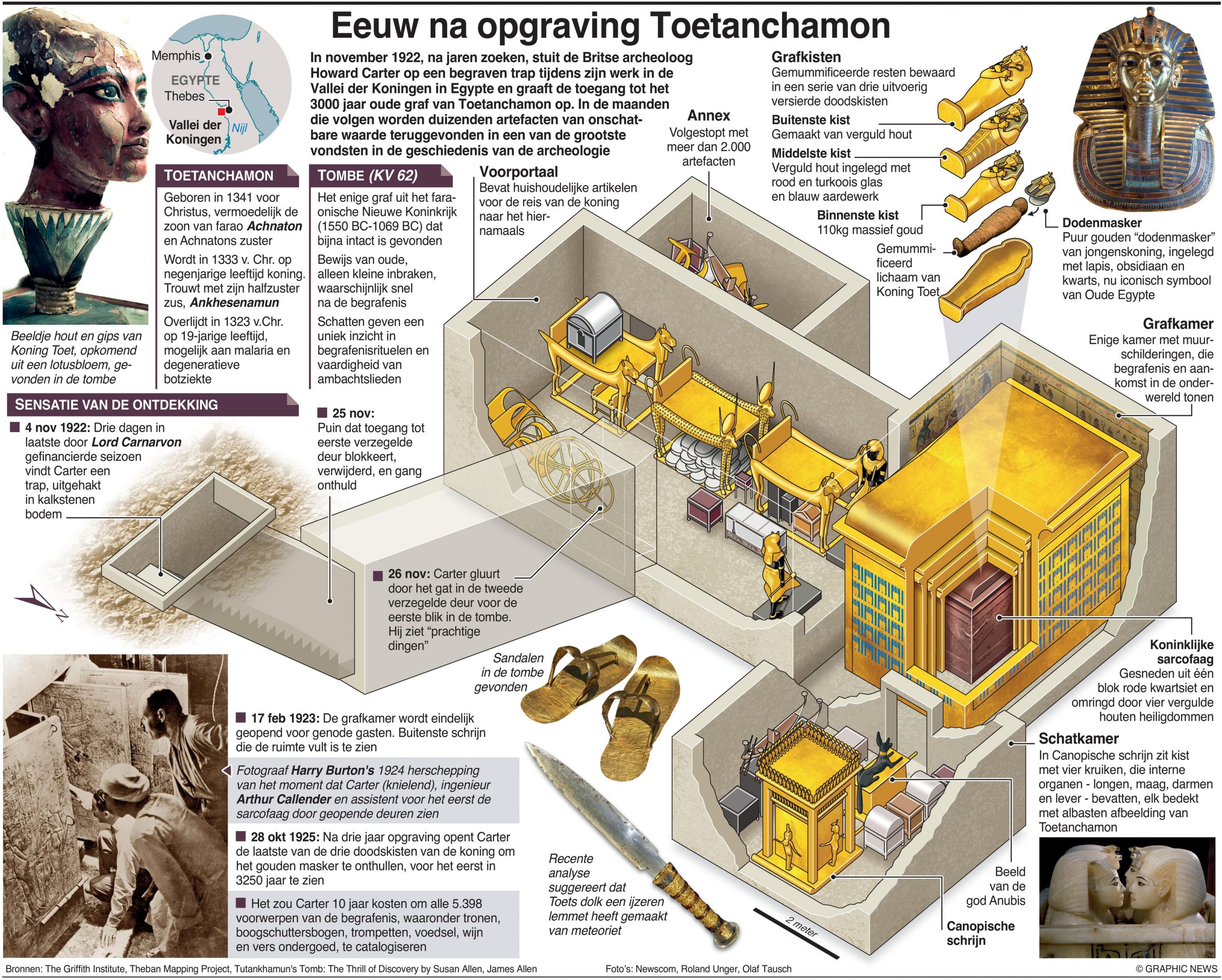 Wat Carter ontdekte, wordt nu beschouwd als een van de grootste vondsten in de geschiedenis van de archeologie: een complete set koninklijke doodskisten uit het faraonische tijdperk van het Nieuwe Rijk, rijkelijk bewerkt en in een verbazingwekkende staat van bewaring, met als middelpunt de gemummificeerde overblijfselen van een tienerkoning onder een goud en blauw “dodenmasker”, dat uiteindelijk door miljoenen zou worden gezien in tentoonstellingen over de hele wereld en dat de pracht van het oude Egypte zou gaan vertegenwoordigen.