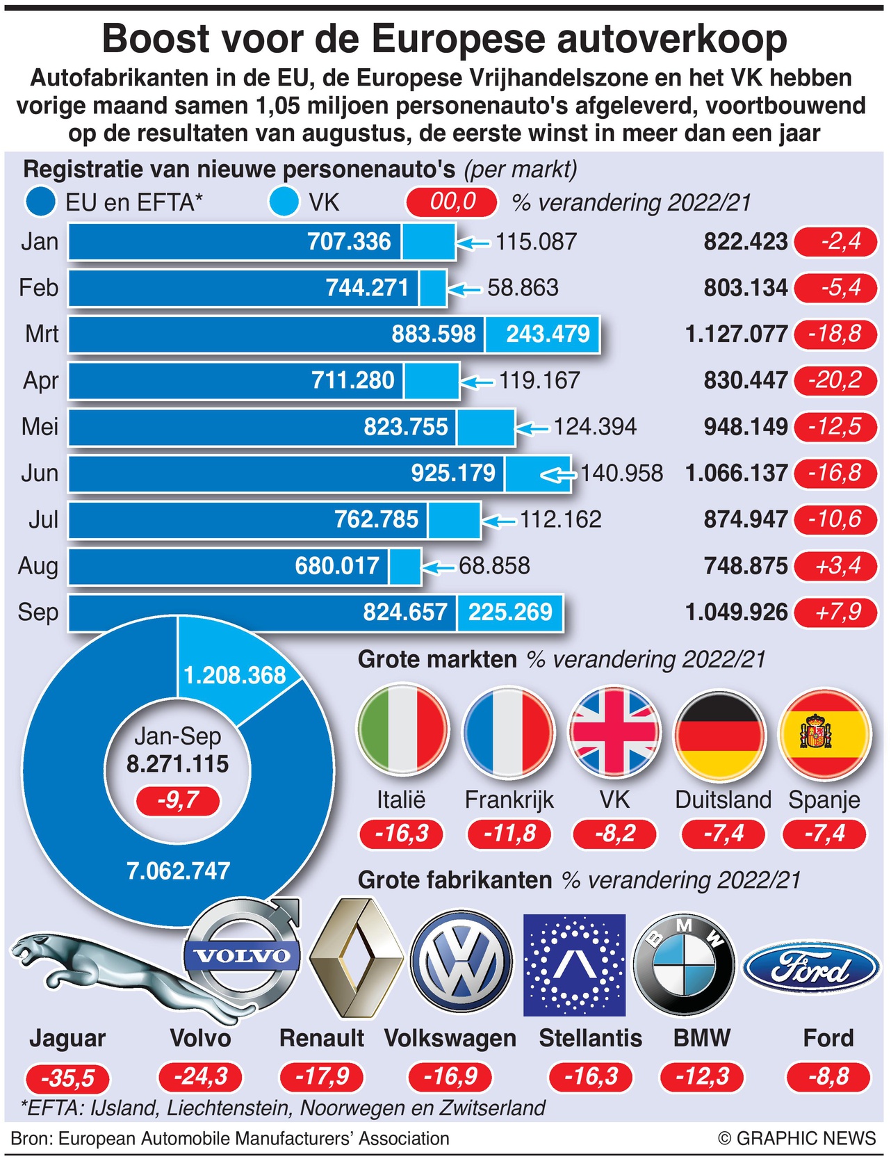19 oktober 2022 – Autofabrikanten in de EU, de Europese Vrijhandelszone en het VK leverden vorige maand samen 1,05 miljoen personenauto’s, voortbouwend op de resultaten van augustus, de eerste winsten in meer dan een jaar.