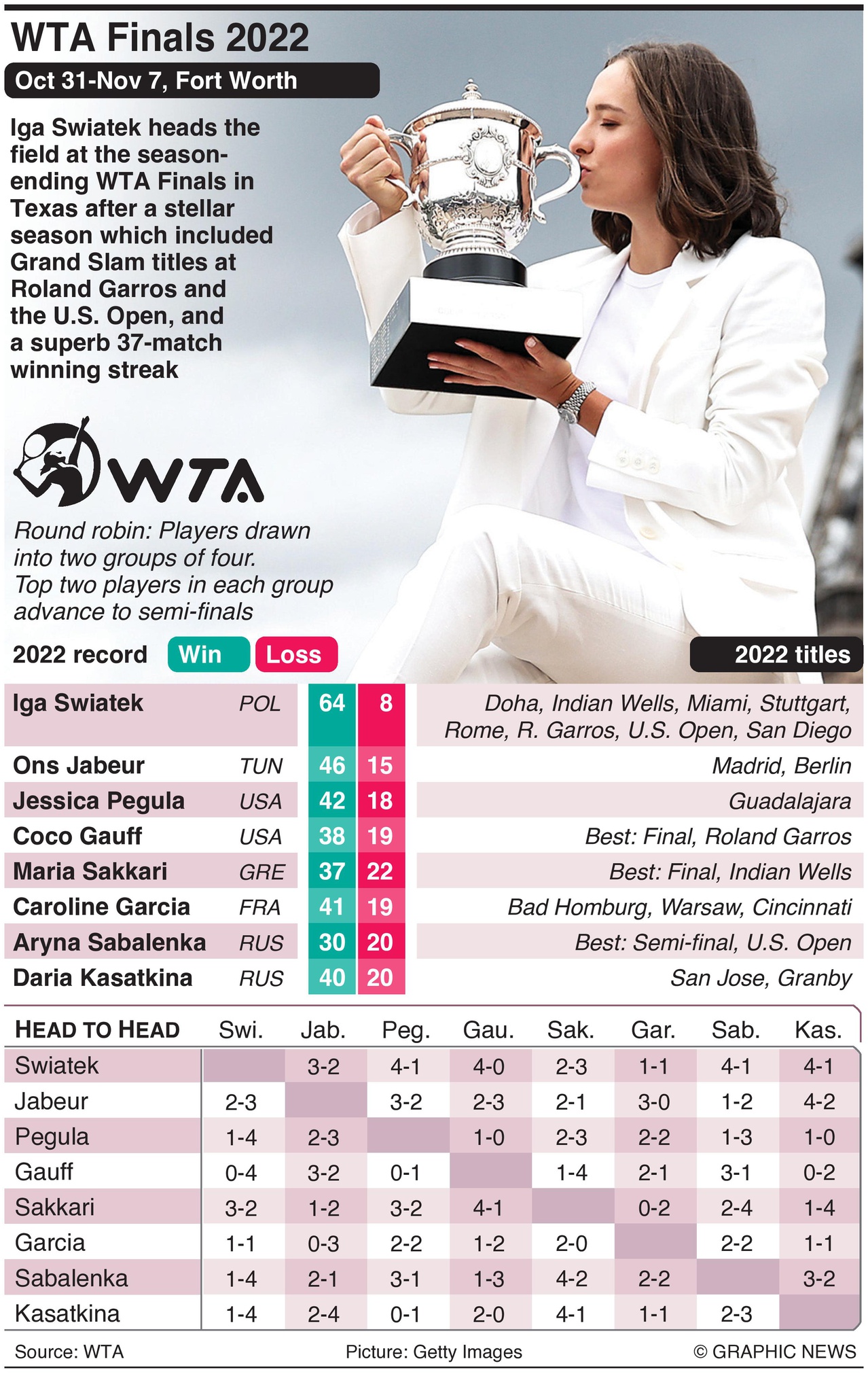 Iga Swiatek voert het veld aan bij de WTA Finals die het seizoen eindigde in Texas na een geweldig seizoen, met onder meer Grand Slam-titels op Roland Garros en de U.S. Open, en een schitterende reeks van 37 wedstrijden.