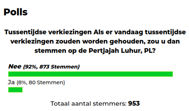 Van het aantal van 953 uitgebrachte stemmen, heeft maar liefst 92% (873 stemmen) aangegeven niet op de Pertjajah Luhur te zullen stemmen bij tussentijds verkiezingen. Slechts 80 personen (8 procent) stelt in dat geval wel op die partij te zullen stemmen.