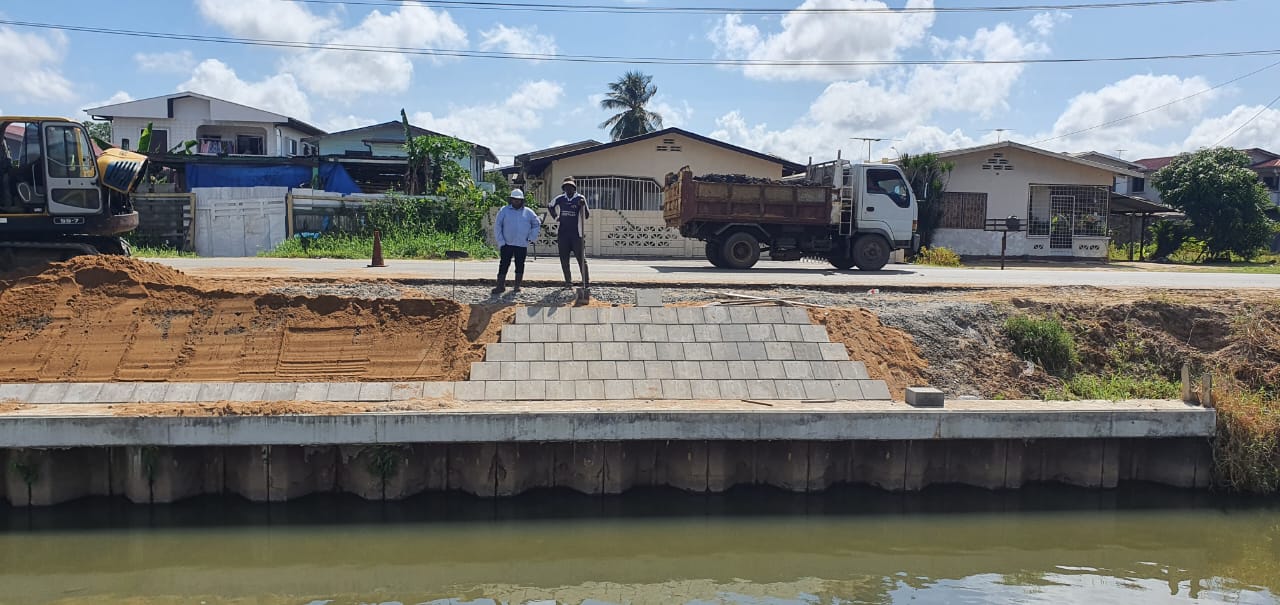 De taludbekleding aan de Quaranistraat in het ressort Munder verloopt vlot. Het NV Nationaal Uitvoeringsbedrijf (N.V. NUB) is bezig met het aanleggen van geotextiel, klinkzand en basecourse. Verder wordt de kanaalbodem verhard. Ook wordt de berm en het talud onderhouden door de aannemer, zo laat het ministerie van Openbare Werken donderdag 27 oktober weten.