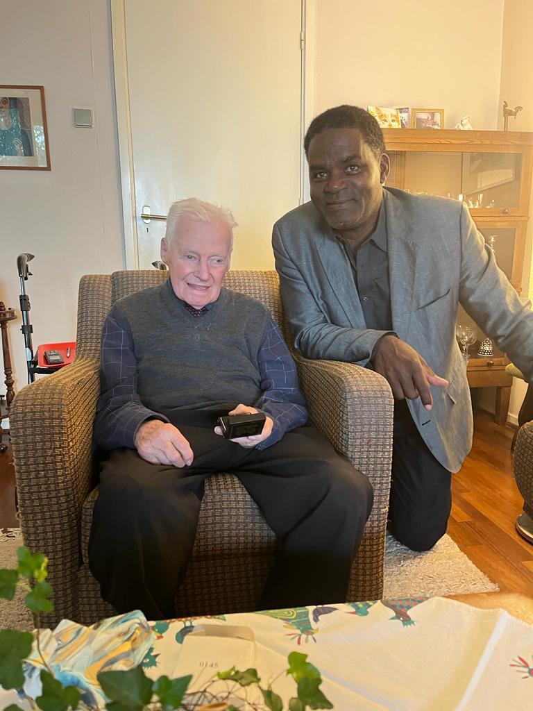 (Foto: Hugo Fernandes Mendes overhandigde begin dit jaar (2022) te Amsterdam op verzoek van de redactie van het SJB een gouden speld met oorkonde aan prof. Stein als blijk van waardering voor zijn aan het SJB verleende diensten als auteur en contactwetenschapper.)