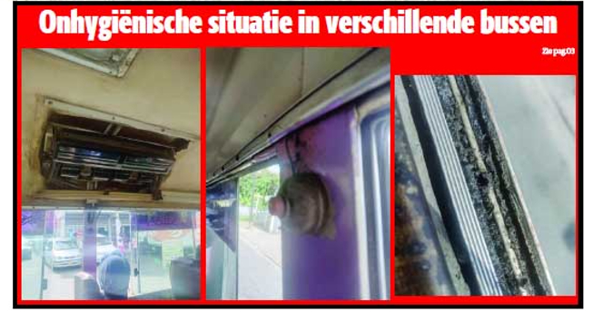 De bezorgde burger Radj heeft de redactie van Dagblad Suriname benaderd. Hij ergert zich aan het feit dat de bussen er niet hygiënisch uit zien. “De bushouders zijn verantwoordelijk voor de hygiëne, maar er dient een persoon of personen te zijn die dit ook controleren.” Radj vraagt zich dus af waar de controle blijft. “De bussen zien er niet hygiënisch uit, de kappen van de airco’s zijn heel zwart geworden van al het vuil dat zich schuilhoudt in de airco’s, ramen en zelf bij de schellen van de bussen. Dit alles moeten passagiers dagelijks inhaleren wanneer ze in en uit een bus stappen.”