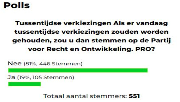 Slechts 105 van het in totaal van 551 personen die een poll op de website van Dagblad Suriname hebben ingevuld, heeft aangegeven bij eventuele tussentijdse verkiezingen op de PRO te zullen stemmen, 19 procent. 446 mensen hebben daarentegen aangevinkt dat zij niet op de PRO gaan stemmen (81 procent).