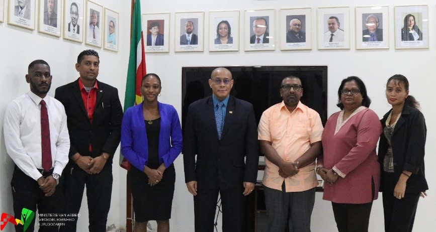 (Foto bijschrift: De leden van de commissie ‘Evaluatie Wet Minimumloon 2019’. Vlnr: Sidney Alleyne, Ashween Orie, Wihtley Lodik, minister Steven Mac Andrew, Glenn Piroe (voorzitter), Shoblina Chotkhan-Somai en Mandy Troenopawiro.)