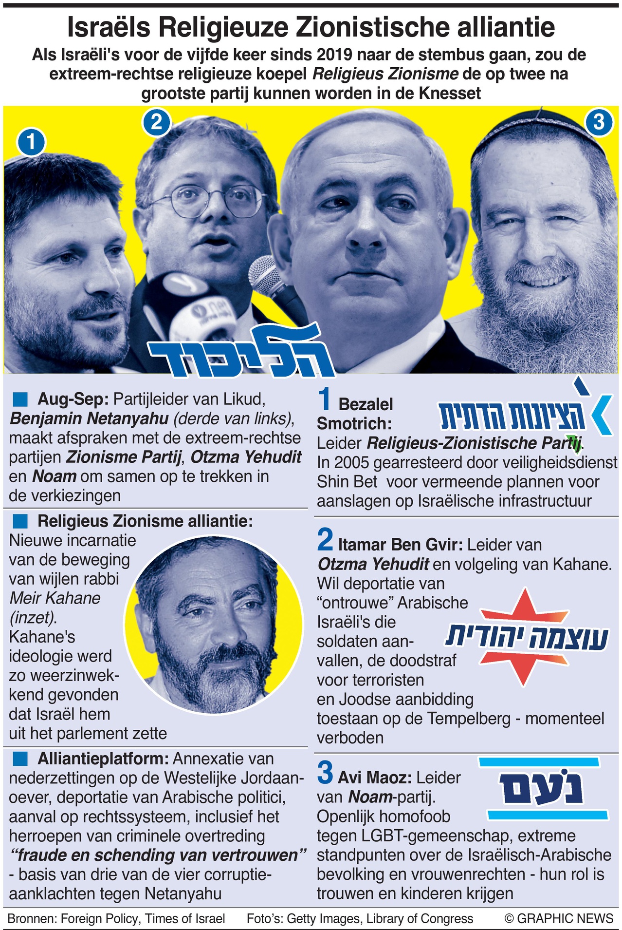 Religieus Zionisme is een extreemrechtse partij onder leiding van Bezalel Smotrich, die samenwerkt met de neo-Kahanistische Otzma Yehudit-partij onder leiding van Itamar Ben Gvir – een leerling van de extremistische rabbijn Meir Kahane – en Avi Maoz’s openlijk homofobe anti-LGBT Noam factie.