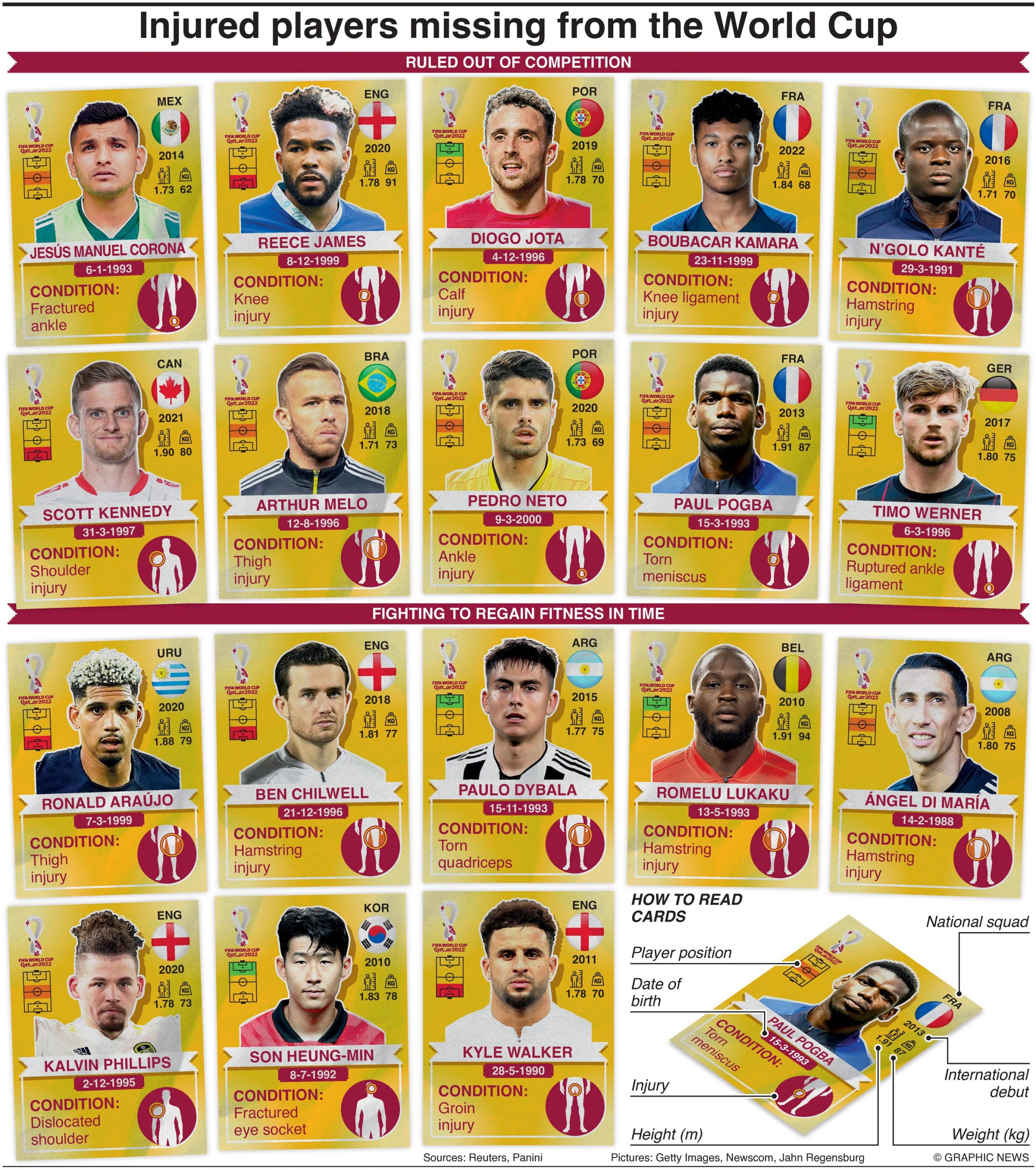 20 november 2022 – 18 december 2022 – Tien voetballers zijn vanwege blessures uitgesloten van het WK, terwijl er nog acht zenuwachtig wachten om te zien of ze op tijd weer fit kunnen worden.