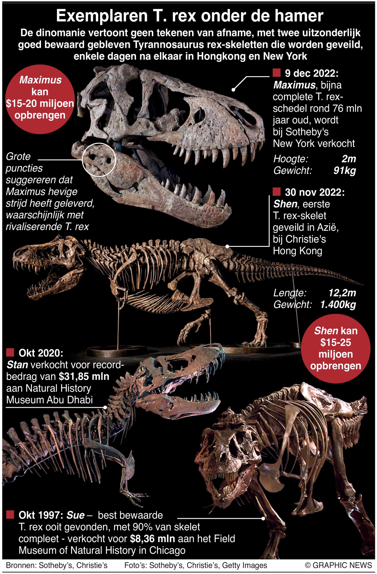 Ten eerste wordt op 30 november een T. rex-skelet van 1.400 kg geveild bij Christie’s in Hong Kong, waar het naar verwachting voor maar liefst $ 25 miljoen zal worden verkocht. Het 66-68 miljoen jaar oude exemplaar, genaamd Shen, zal het eerste T. rex-skelet zijn dat ooit in Azië wordt geveild.