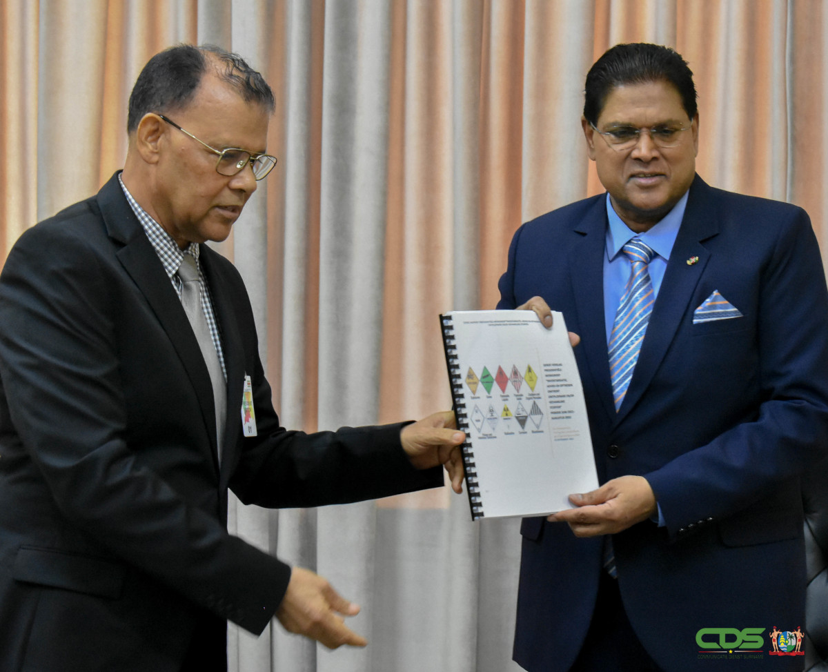 De presidentiële werkgroep Inventarisatie en Advies Ontplofbare en/of Gevaarlijke stoffen heeft woensdag 16 november haar derde verslag aangeboden aan president Chandrikapersad Santokhi. In dit document wordt speciale aandacht besteed aan het opslaan en vervoeren van ontplofbaar materiaal buiten woonwijken. Het verslag werd middels beeld gepresenteerd, waarna Santokhi een gedrukte kopie in ontvangst mocht nemen.